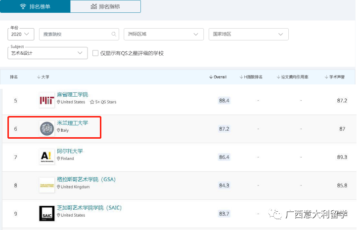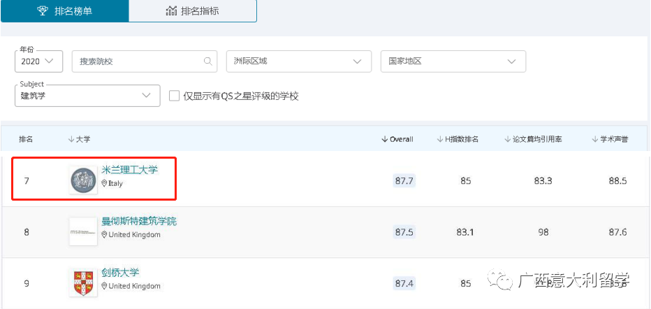 米蘭理工大學(xué)2020年QS全球大學(xué)排名