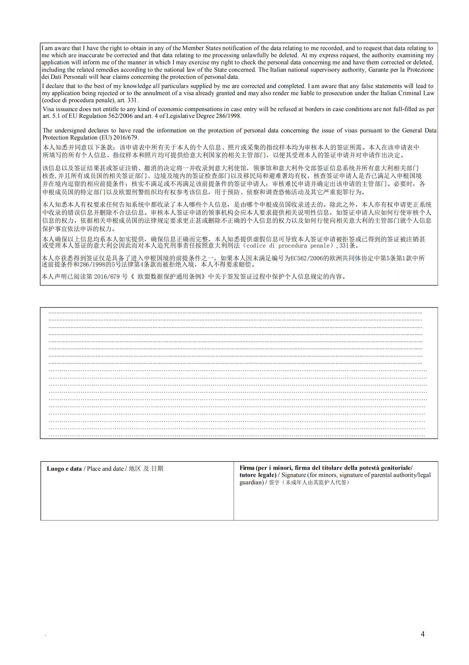 用英語或者意大利語或者中文拼音正式填寫 并由申請人親筆簽名的申請表(中國申請人簽字應為文 字,不應為拼音)。未滿 18 歲的申請人,申請表須由至少一方父母或法定監護人簽字。 簽證表可以在簽證中心領取,也可以在意大利簽證中心官網下載后A3紙彩打。