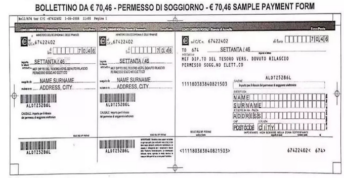 大信封里,除了MODULO 1之外還有一張工本費的單據需要填寫!鑒于每年辦居留費用都會變化,填寫紅色繳費單時填好個人基本信息,金額等到郵局交材料時再確認。