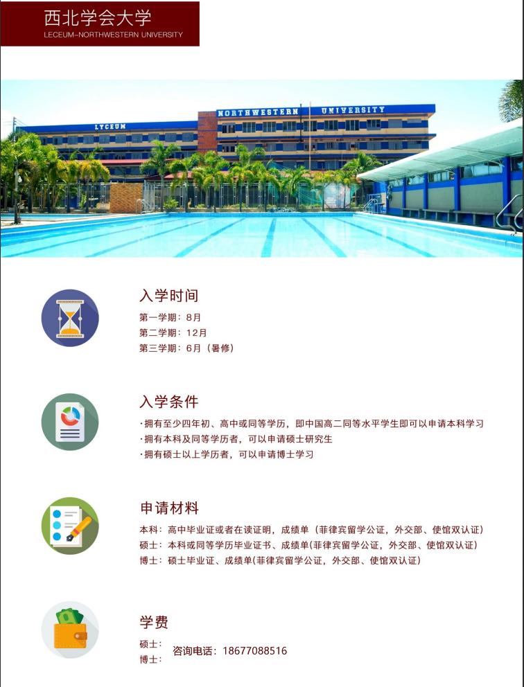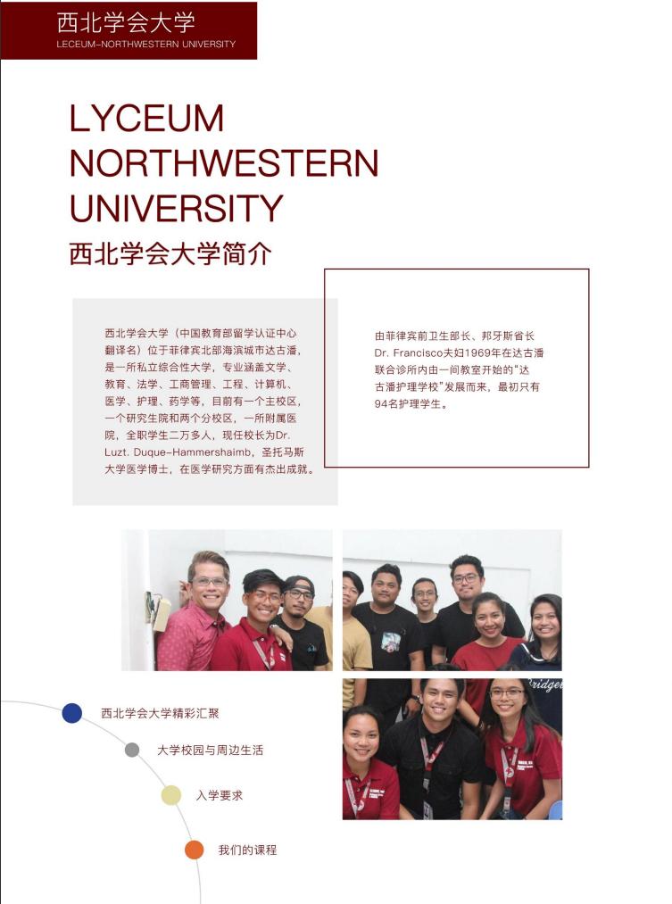菲律賓萊西姆西北大學(xué)(LECEUM-NORTHMESTERN UNVERSITY )位于菲律賓北部海濱城市達(dá)古潘,離首都馬尼拉國際機(jī)場190公里,離菲律賓克拉克機(jī)場100公里,是一所成立于1969年的私立綜合性大學(xué),專業(yè)涵蓋文學(xué)、教育、法學(xué)、工商管理、工程、計(jì)算機(jī)、醫(yī)學(xué)、護(hù)理、藥學(xué)等,目前有一個(gè)主校區(qū),-一個(gè)研究生院和兩個(gè)分校區(qū),一所附屬醫(yī)院,全職學(xué)生二萬多人,現(xiàn)任校長為Dr.Luzt. Duque-Hammershaimb,圣托馬斯大學(xué)醫(yī)學(xué)博士,在醫(yī)學(xué)研究方面有杰出成就。