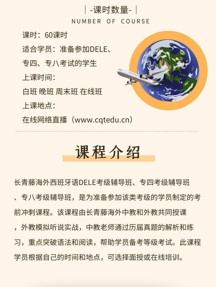 長青藤海外西班牙語DELE考級輔導班、專四考級輔導班、專八考級輔導班,是為準備參加該類考級的學員制定的考前沖刺課程。該課程由長青藤海外中教和外教共同授課,外教模擬聽說實戰,中教老師通過歷屆真題的解析和練習,重點突破語法和閱讀,幫助學員備考等級考試。此課程學員根據自己的時間和地點,可選擇面授或在線培訓。