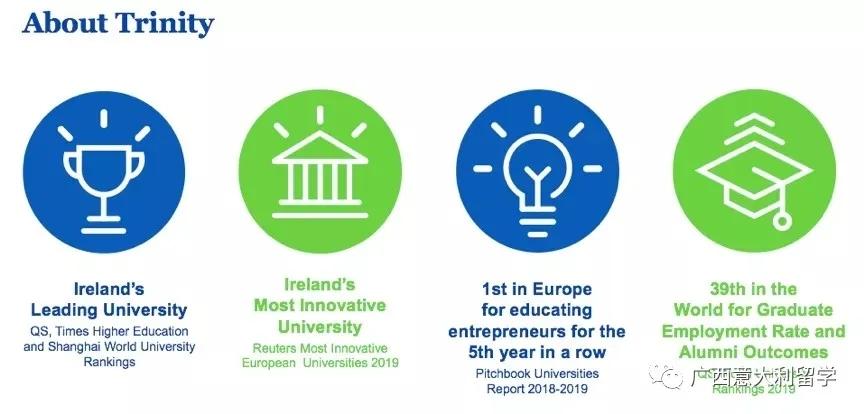 都柏林圣三一大學(Trinity College Dublin)正式名稱為:College of the Holy and Undivided Trinity of Queen Elizabeth near Dublin (伊麗莎白女王在都柏林附近神圣不可分割的三一學院)位于愛爾蘭首都都柏林,是1592年英國女王伊麗莎白一世下令為愛爾蘭且參照牛津、劍橋大學模式而興建的一所世界頂級研究型大學。都柏林圣三一大學是公認與哈佛,斯坦福,牛津,劍橋齊名的大學。至今已428年歷史,是愛爾蘭最古老的大學、亦是不列顛及愛爾蘭八大古典大學之一。其中生物醫學,計算機科學、古典研究等處于世界領先地位,其附屬愛爾蘭皇家音樂學院,更是一所世界頂尖的音樂學院。調查數據顯示,圣三一商學院(Trinity Business School)是歐洲培養企業家最多的商學院。