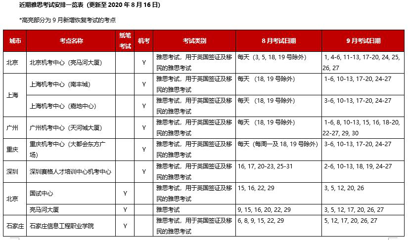 · 9月北京機考中心新增9月1日, 5日, 12日, 26日, 27日,廣州機考中心新增9月8日, 15日, 16日, 22日, 23日, 29日, 30日的雅思和用于英國簽證及移民的雅思(IELTS for UKVI)機考場次,其它機考中心的場次和考位也在陸續增加中。
